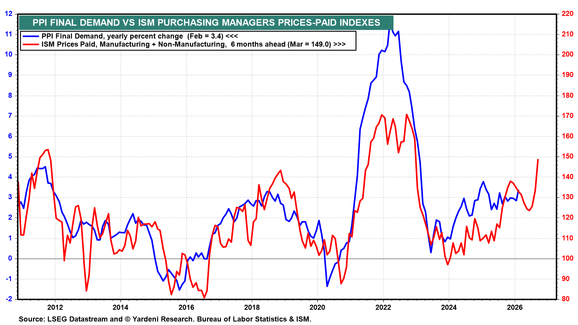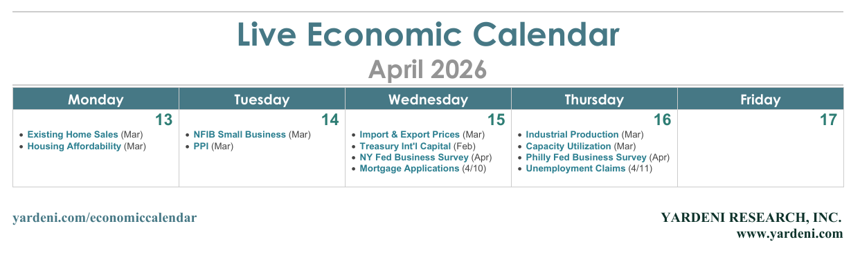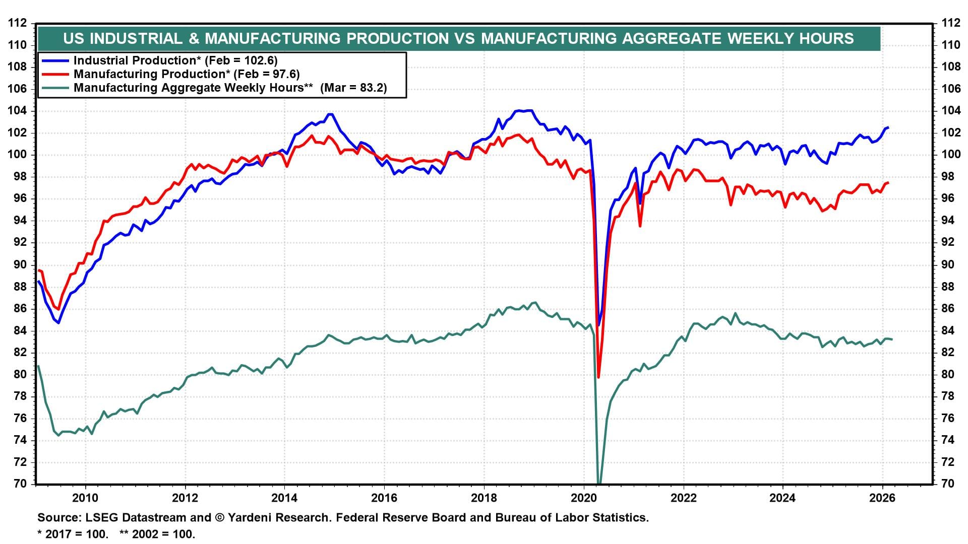 (3) Industrial production. Industrial production (Wed) stood at 102.6 in February, with manufacturing at 97.6, still below their pre-pandemic highs (chart). However, both have been trending higher since early 2025 while manufacturing hours worked have been relatively flat, suggesting that productivity is growing. We expect more of the same in March, with strong gains in output of information technology hardware and defense.