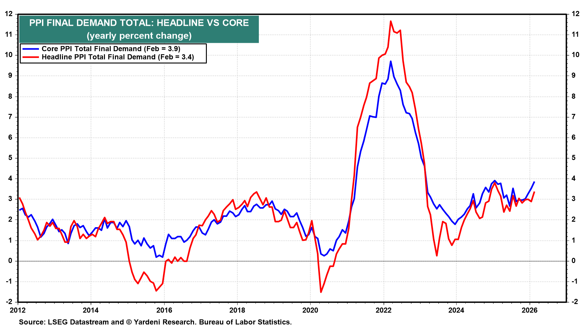 (1) PPI. The March PPI report (Tue) will show that the headline and core inflation rates of this measure of producer prices heated up significantly last month. They were already heating up during February before the war started (chart). Both are likely to rise to 4.0% y/y.