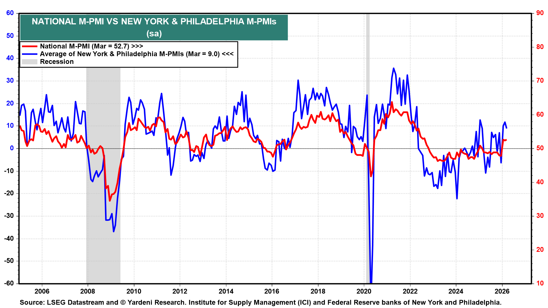 (4) Business & regional surveys. April’s regional Fed surveys will be the first forward-looking reads on business conditions since the war started, with the NY Fed (Wed) and Philly Fed (Thu) surveys due. Both tend to be very volatile (chart).