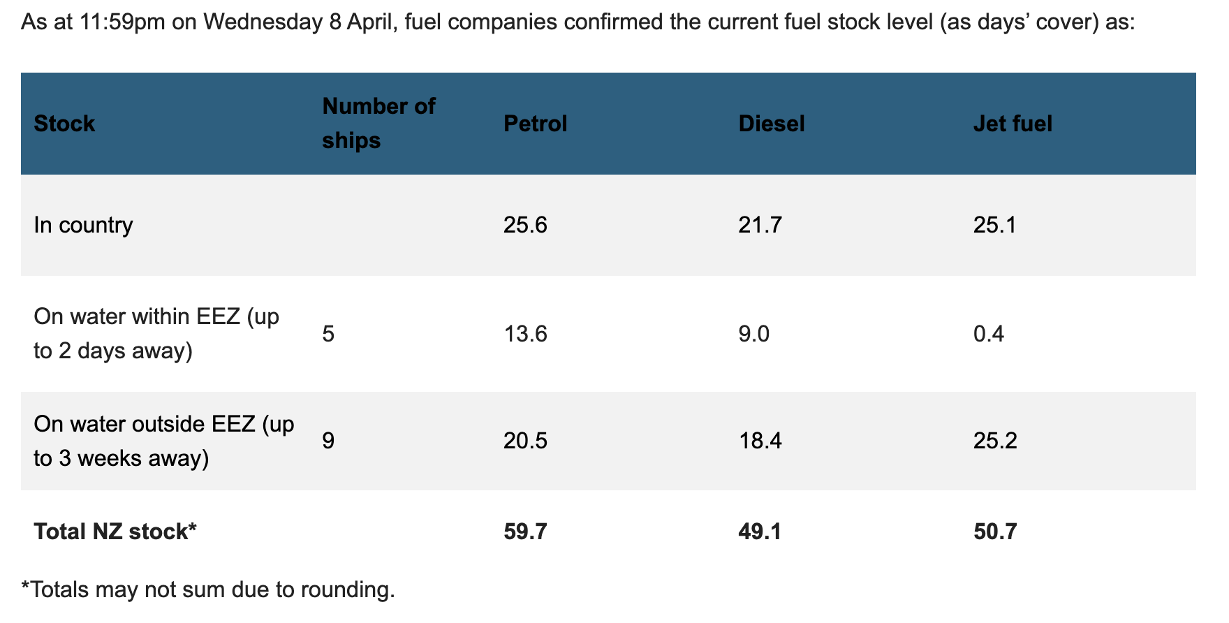 The latest figures, current as of 11:59pm on Wednesday 8 April, show the country has 59.7 days of petrol, 49.1 days of diesel and 50.7 days of jet fuel available across all sources.