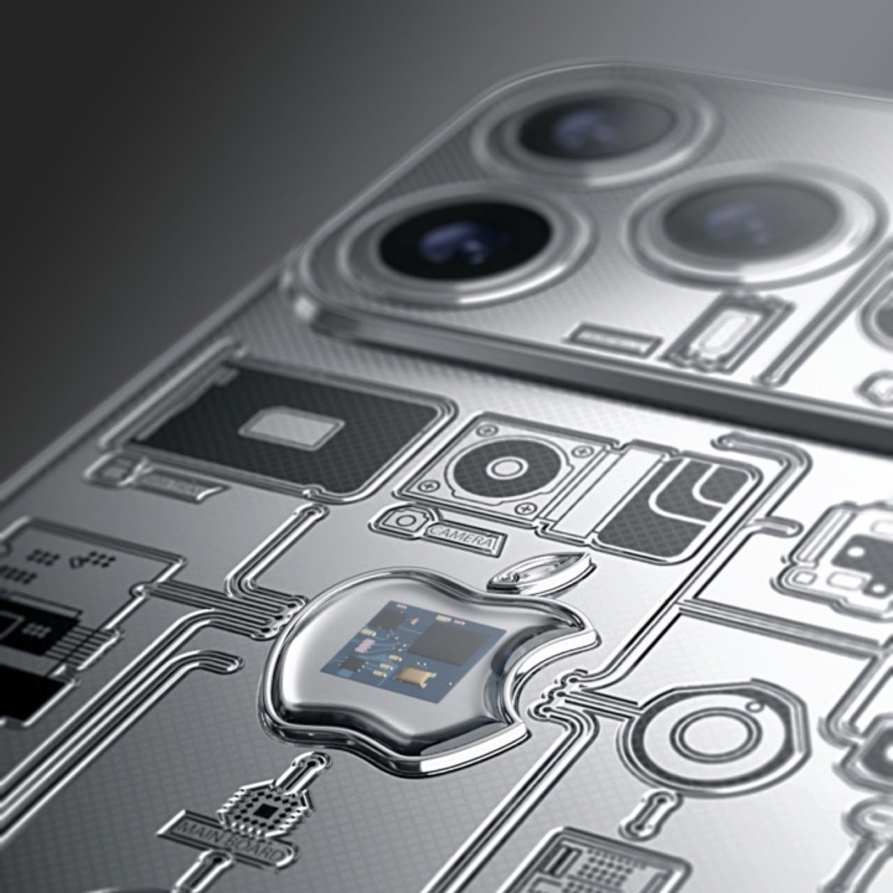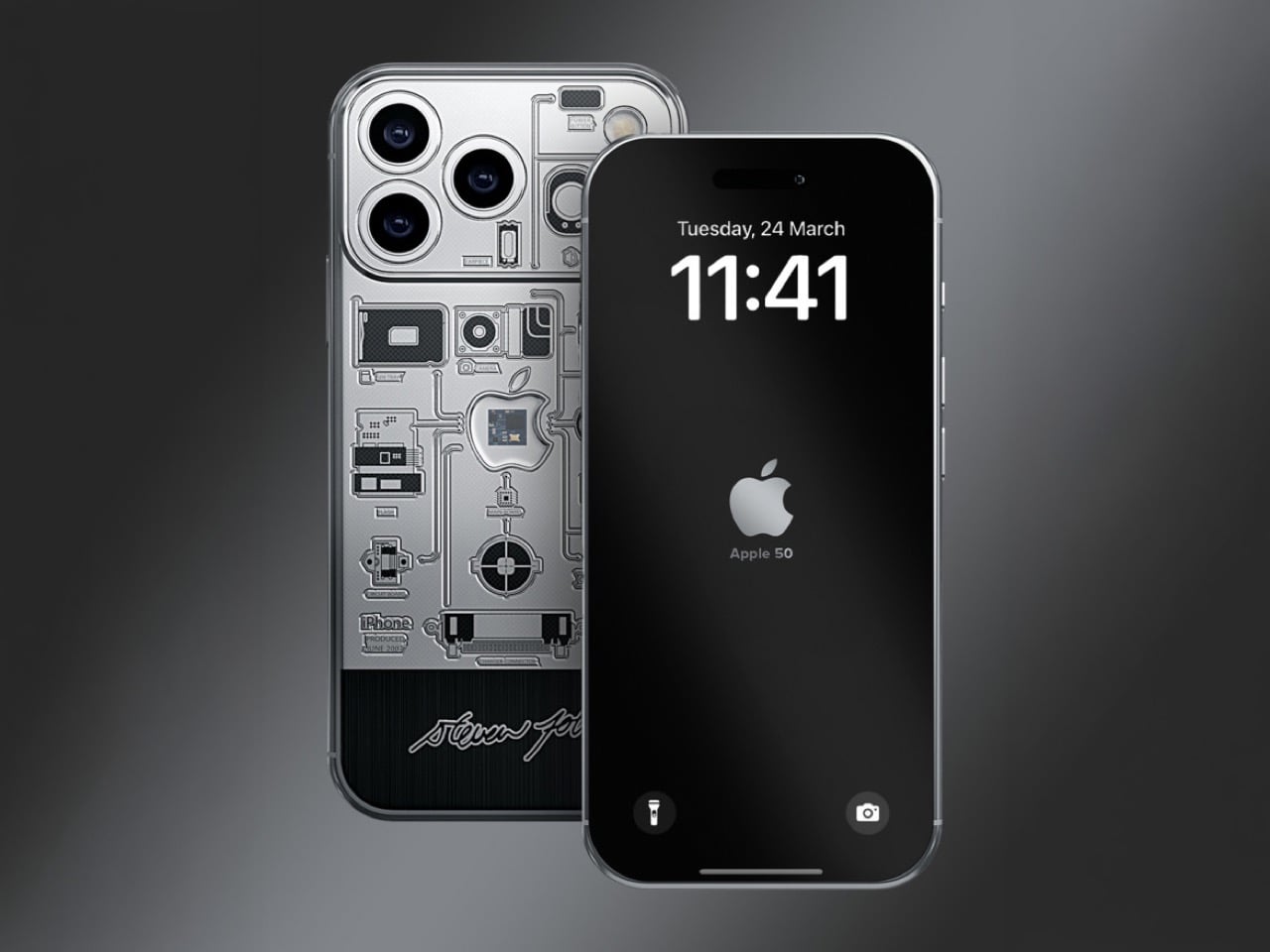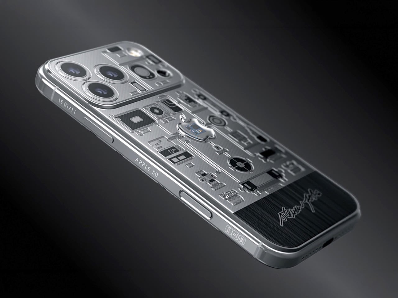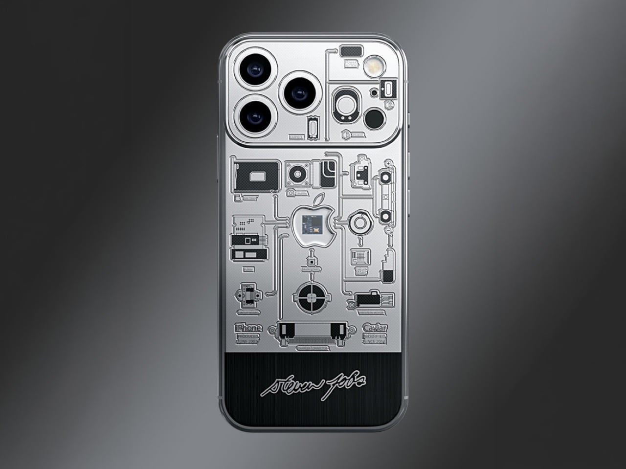 The chassis is titanium with a black PVD coating, and the color story it tells is deliberate. Black and silver, offset logo placement, minimalist engraving: Caviar is visually quoting the 2007 original without cosplaying as a replica, which is the smarter move. The motherboard fragment anchors the rear panel at dead center, with circuit-trace engravings fanning outward from it like a schematic that never quite finished rendering. Jobs’ signature runs along the frame. The whole composition functions as a timeline compressed into a single object, 2007 hardware embedded inside 2025 hardware, separated by a few millimeters of machined titanium.