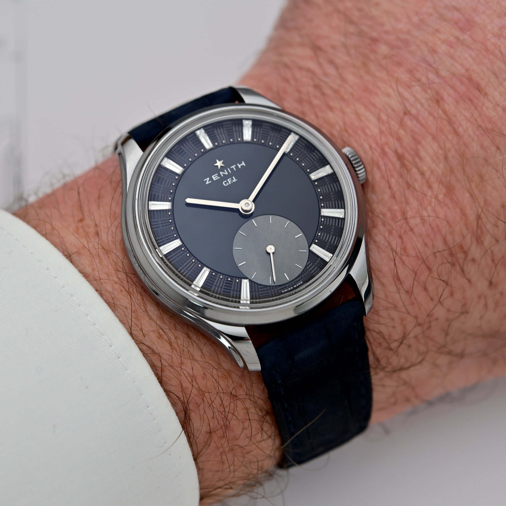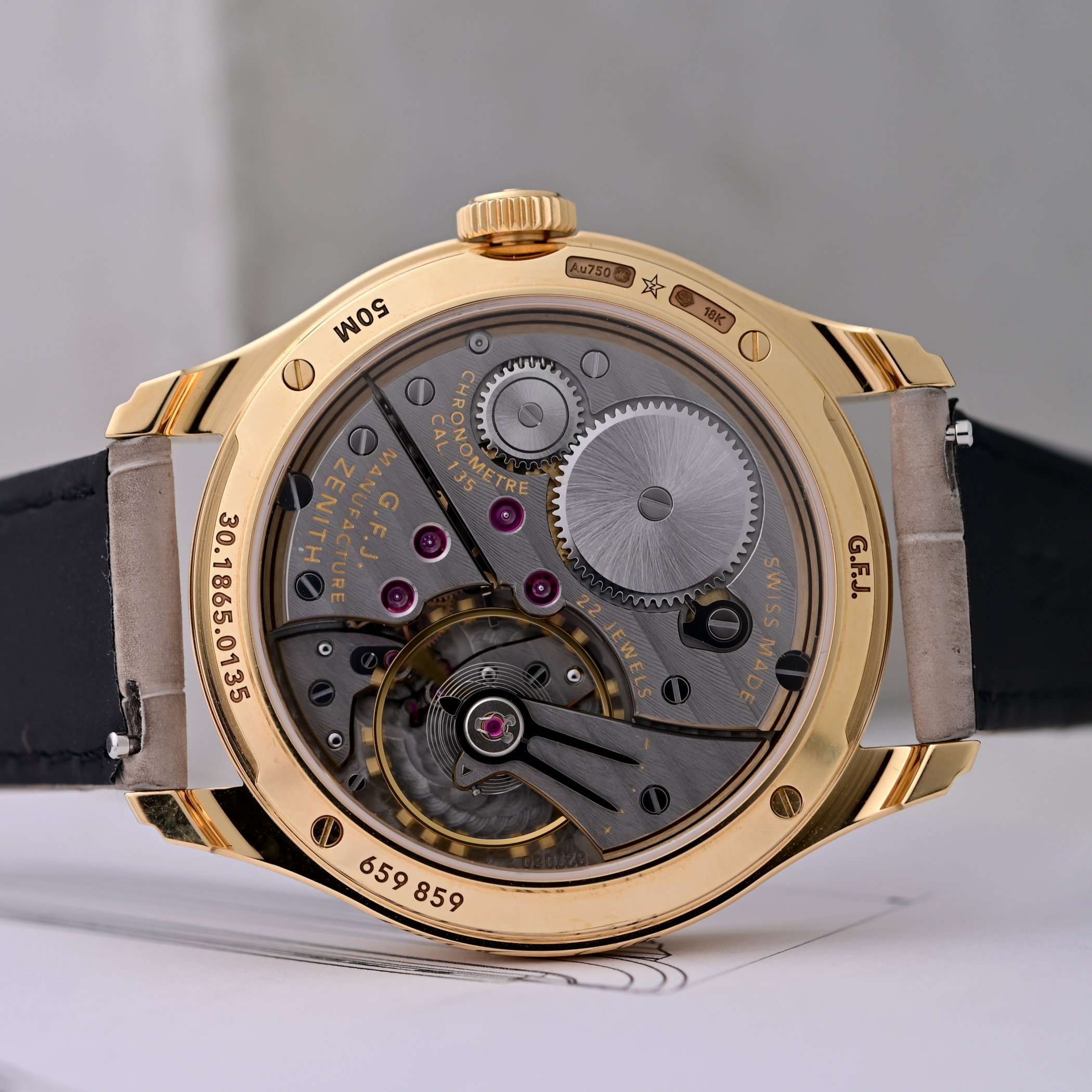 Both watches continue the story of the Calibre 135, a movement originally developed in the late 1940s specifically for observatory chronometry competitions. Created by watchmaker Ephrem Jobin, the calibre was designed with a large barrel to deliver stable power and an oversized balance wheel to maximise rate stability and featured an offset centre wheel to free space for the large regulator system. Produced between 1949 and 1962, the calibre 135 existed in both a commercial version and a competition-grade 135-O. The latter became one of the most successful chronometer movements ever produced. Carefully prepared by Zenith’s chronométriers Charles Fleck and René Gygax, the 135-O won more than 230 observatory prizes and secured five consecutive first places at the Neuchâtel Observatory from 1950 to 1954, a record that still stands.