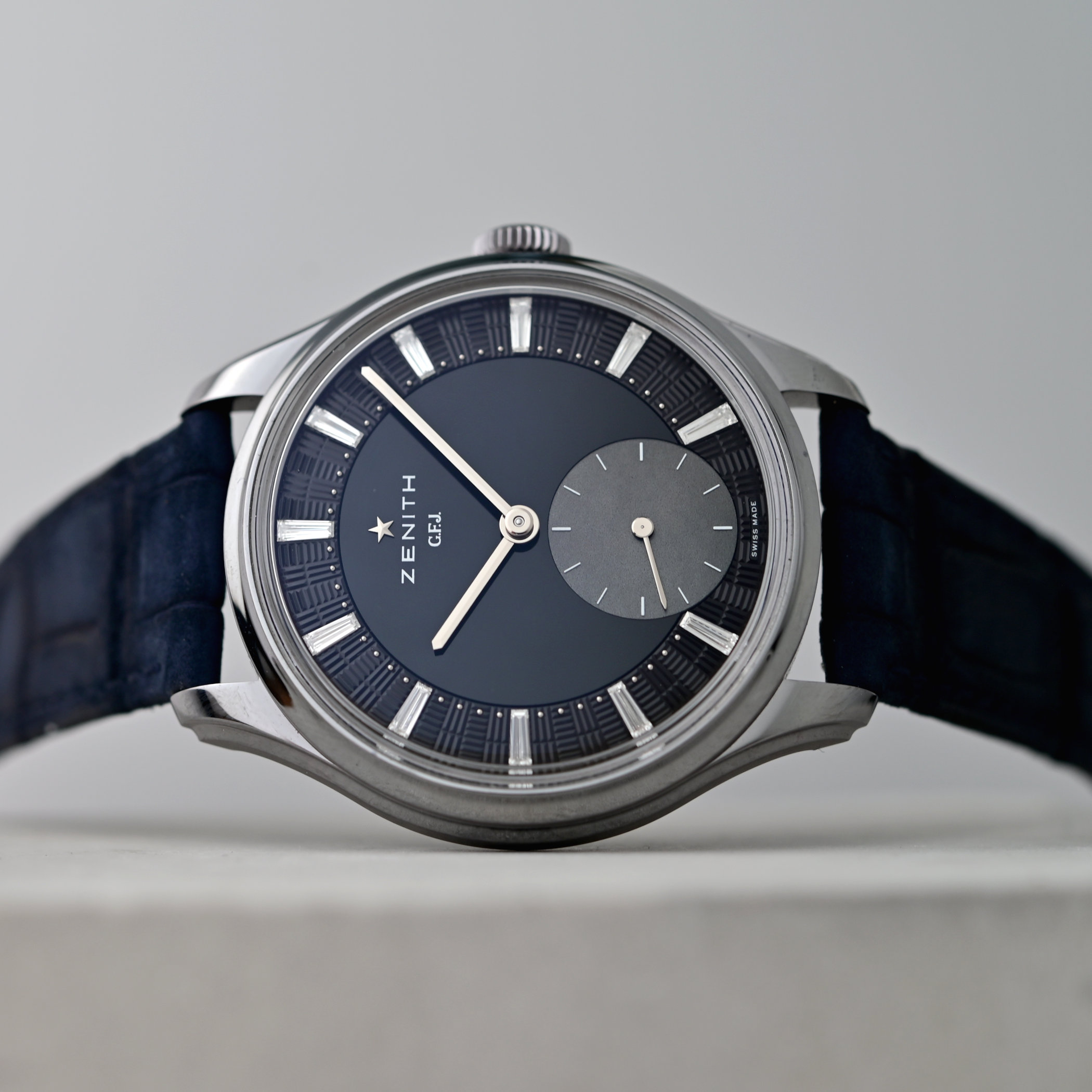 Quick facts – 39.15mm x 10.5mm tantalum case – stepped bezel and sculpted lugs – sapphire crystal front and back – 50m WR – three-part construction dial – brick-pattern guilloché outer ring – black onyx centre – grey mother-of-pearl small seconds at 6 o’clock – baguette-cut diamond hour markers – 18k white gold faceted hands – Zenith Calibre 135 – manual-winding – COSC-certified chronometer – oversized balance with regulation screws – Breguet overcoil hairspring – double arrow-shaped regulator – stop-seconds mechanism – 18,000 vibrations/hour – 72-hour power reserve – blue nubuck alligator strap with titanium pin buckle – additional black alligator strap and grey calfskin strap – limited edition of 20 pieces – Ref. 98.1865.0135/21.C205 – CHF 73,900.
