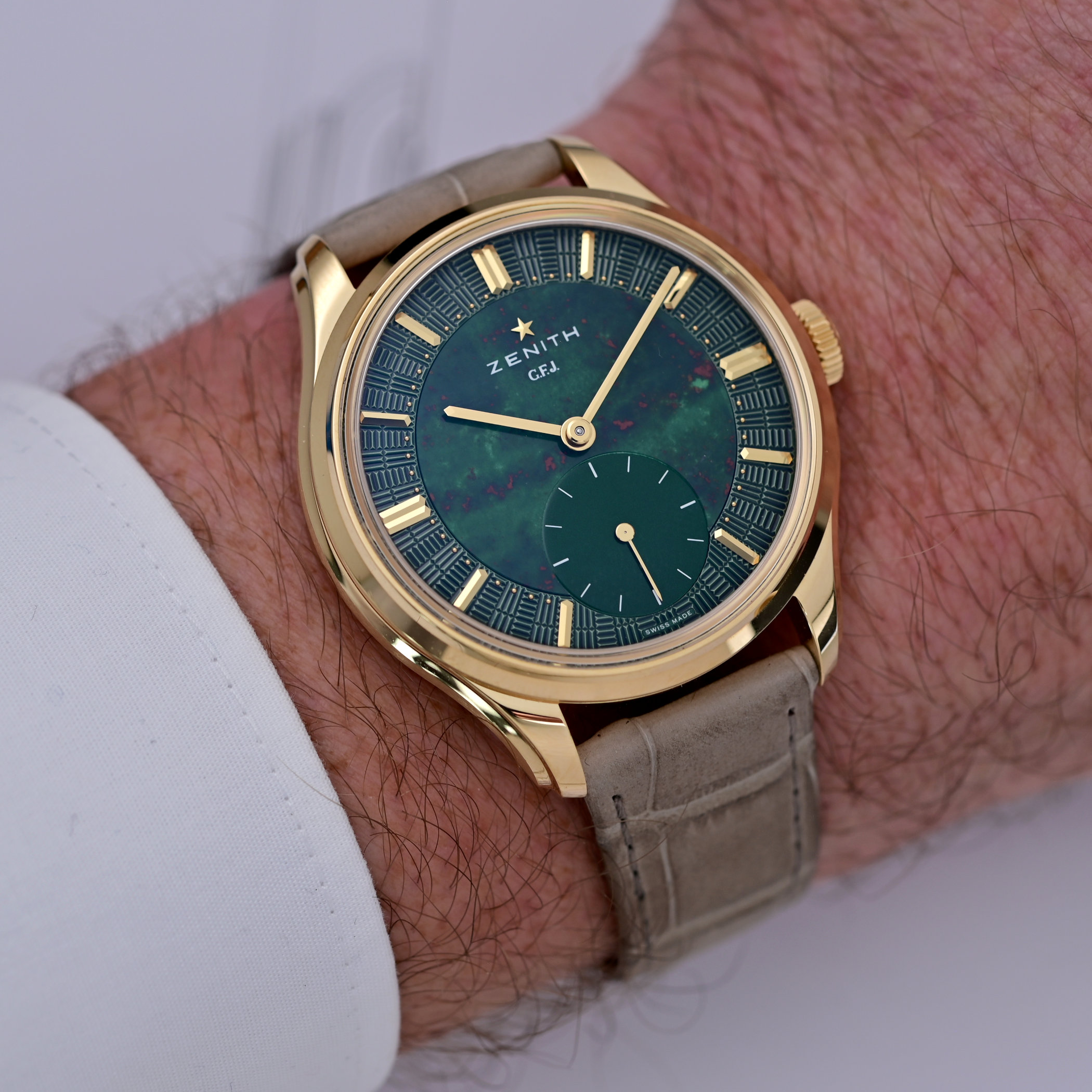 Quick facts – 39.15mm x 10.5mm 18k yellow gold case – stepped bezel and curved lugs – sapphire crystal front and back – 50m WR – dial with brick-pattern guilloché outer ring – bloodstone (jasper) centre – mother-of-pearl small seconds at 6 o’clock – applied yellow-gold indices – yellow-gold faceted hands – Zenith Calibre 135 – manual-winding – COSC-certified chronometer – Breguet overcoil hairspring – stop-seconds mechanism – 18,000 vibrations/hour – 72-hour power reserve – beige nubuck alligator strap with yellow-gold pin buckle – additional green alligator strap and black calfskin strap – optional yellow-gold bracelet – limited edition of 161 pieces – Ref. 30.1865.0135/56.C216 – CHF 48,900.