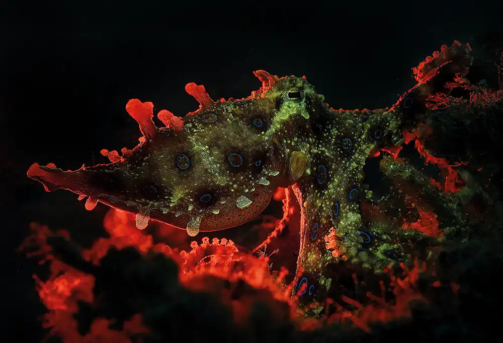 I had to keep pace with the octopus while controlling my buoyancy so as not to stir up the sea bed, at the same time maintaining precise focus on its tiny eyes and coordinating with Opo so that the red backlight would outline the animal perfectly. For a few brief seconds everything aligned, and the moment I captured the frame I knew I had a strong image.