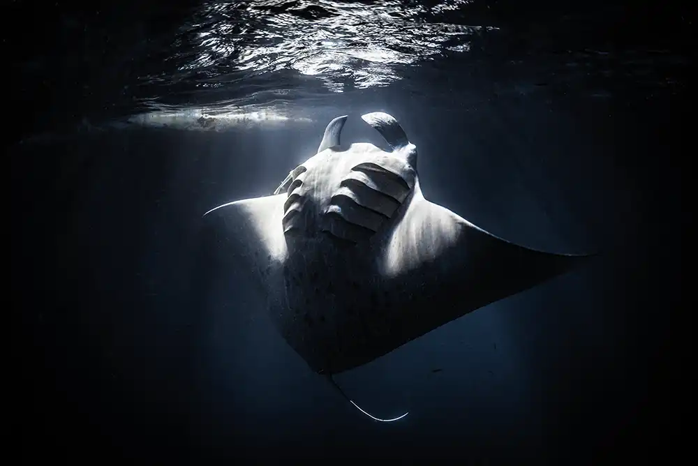 Too much exposure and the highlights would blow out; too little and the manta would dissolve into the black water. I spent nearly two hours experimenting with settings and angles, waiting for the manta to pass through the frame in just the right way.