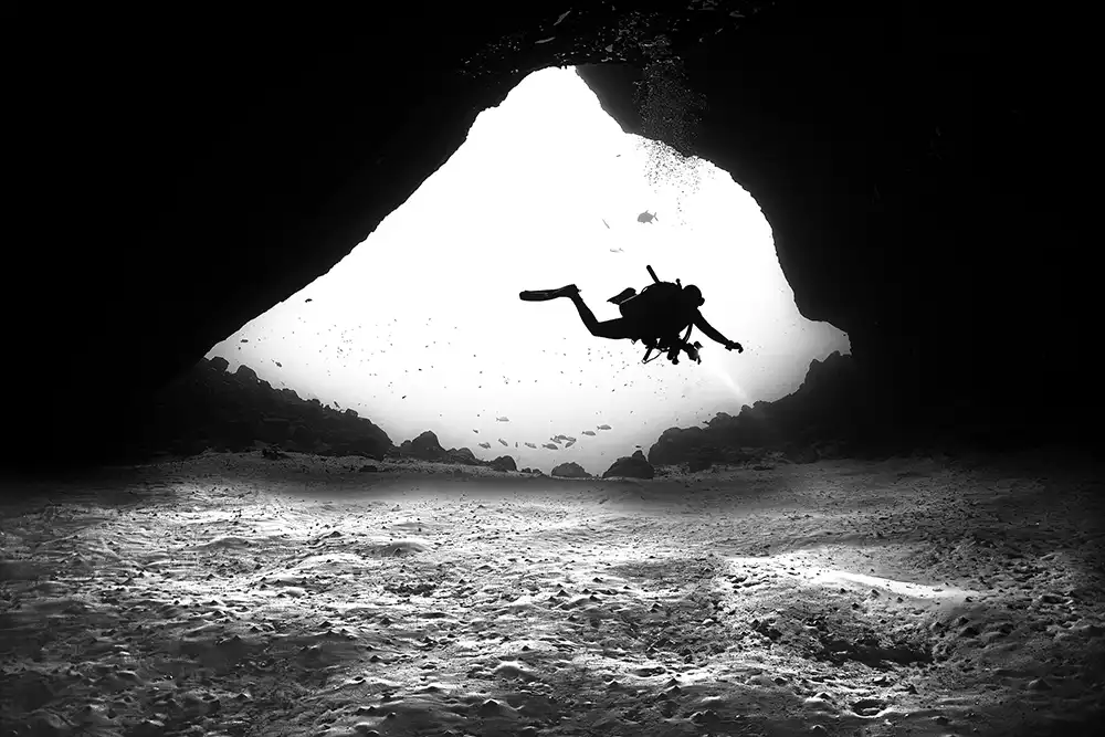 This image was captured at Caverna da Sapata, a dive site in the Fernando de Noronha archipelago, Brazil. My objective was to position myself deep within the cave, using the entrance as a natural frame to create a high-contrast silhouette of the diver against the exterior light. I planned the composition specifically for a black-and-white post-processing edit.