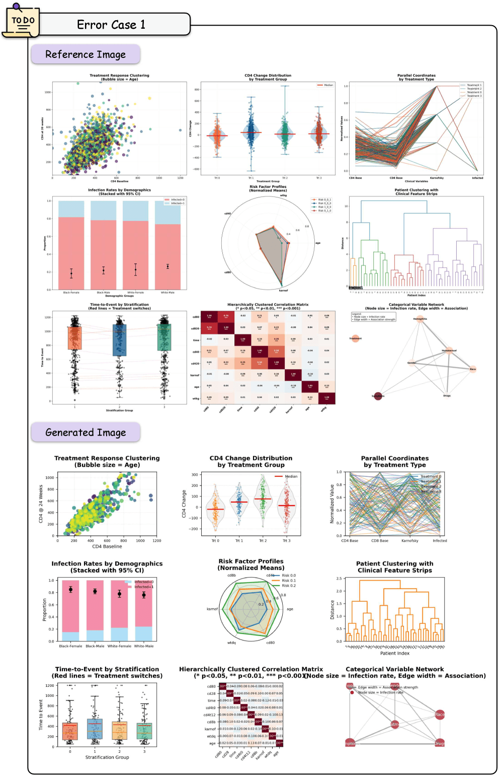 Comparison of a complex nine-part reference chart with medical data and the AI-generated version showing overlapping labels and elements.Reference chart on top, AI-generated version below. The model reproduces the individual subplots correctly but fails at spatial arrangement, with text and elements overlapping. | Image: Zhang et al.