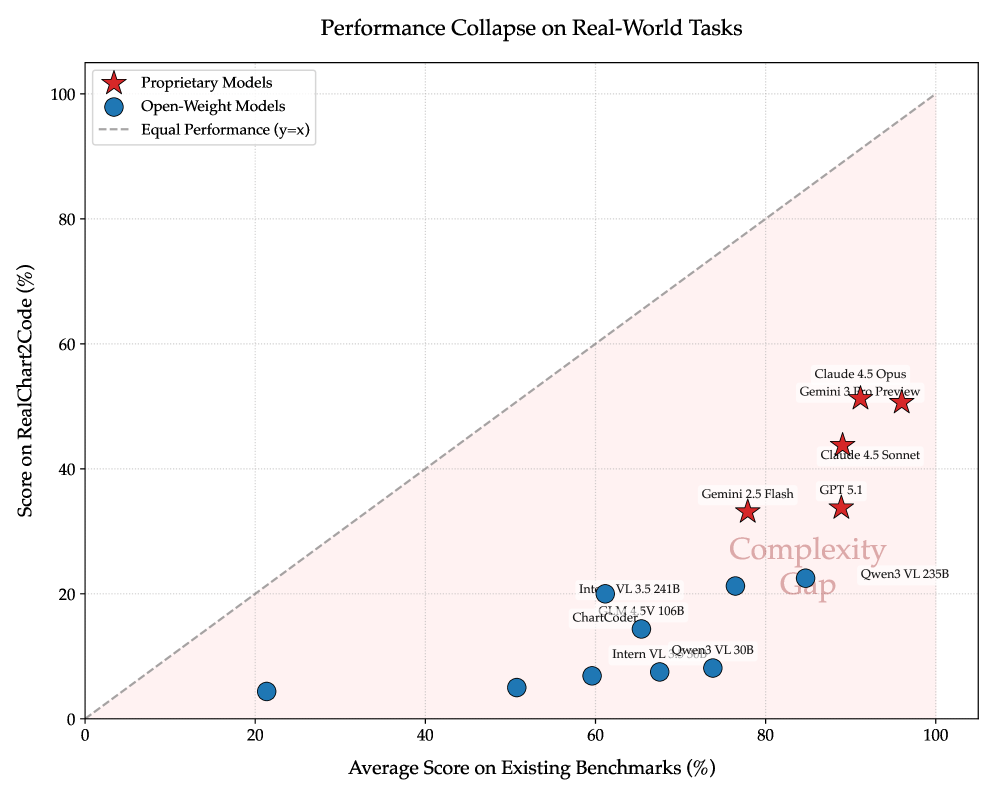 Scatter plot showing model performance on existing benchmarks versus RealChart2Code, with all models falling well below the diagonal.Every model tested falls far below the diagonal marking equal performance on simple and complex benchmarks. Open-weight models drop especially hard on RealChart2Code. | Image: Zhang et al.