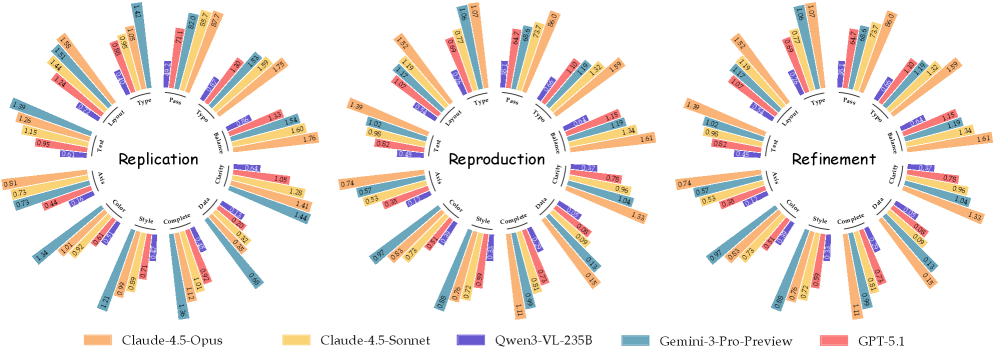 Three radar charts comparing model scores on Replication, Reproduction, and Refinement tasks across eight criteria.The radar charts show how the top models score across eight accuracy criteria. Claude 4.5 Opus and Gemini 3 Pro Preview dominate, while open-weight models trail in nearly every category. | Image: Zhang et al.