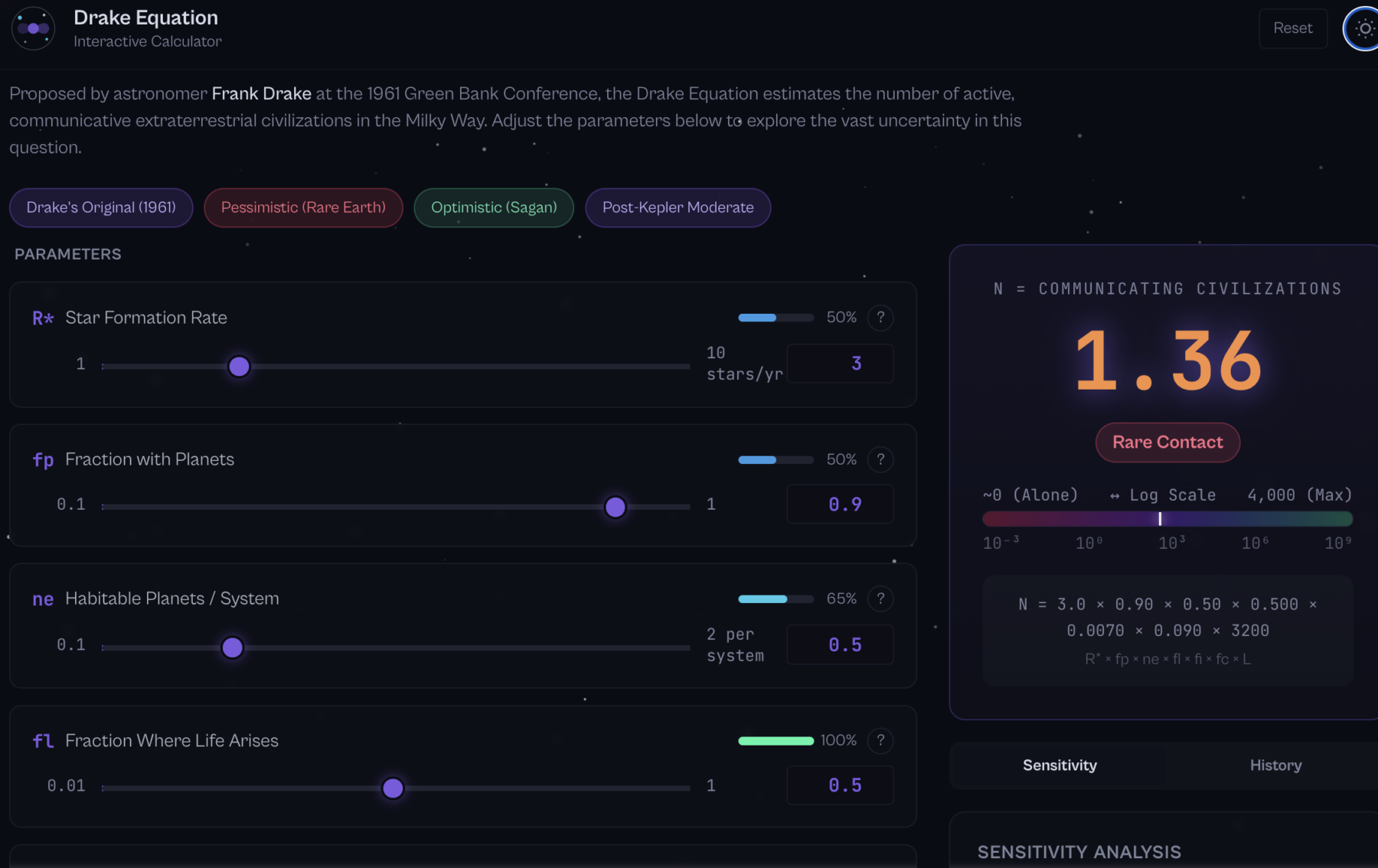 Click through and play around with the sliders. Depending on your assumptions, we either live in a galaxy filled with millions of other advanced civilizations or are all alone.