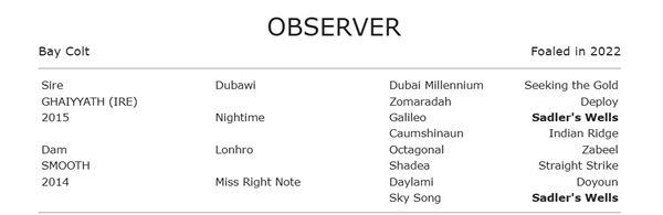 Observer is the best-performed son of Ghaiyyath to retire to stud to date. Ghaiyyath, the world’s highest rated horse in 2020, is by Dubawi, one of the leading sires globally.