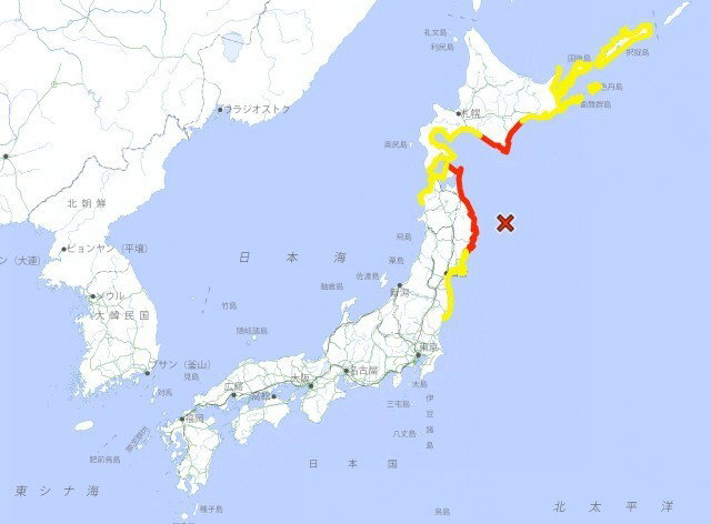 Red zones indicate tsunami warnings, covering Iwate prefecture, central parts of Hokkaido’s Pacific coast, and the Pacific coast of Aomori Prefecture.