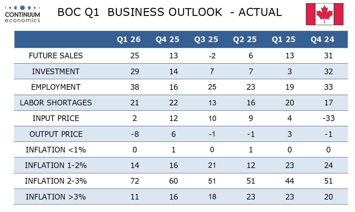 The Bank of Canada’s Q1 business outlook survey released earlier today was generally improved, with the business outlook indicator of -0.36 from -1.78 the strongest since Q4 2022, with respondents reporting less of a drag from trade tensions. The survey may be however overstating current optimism, with some responses having been received before the outbreak of war.