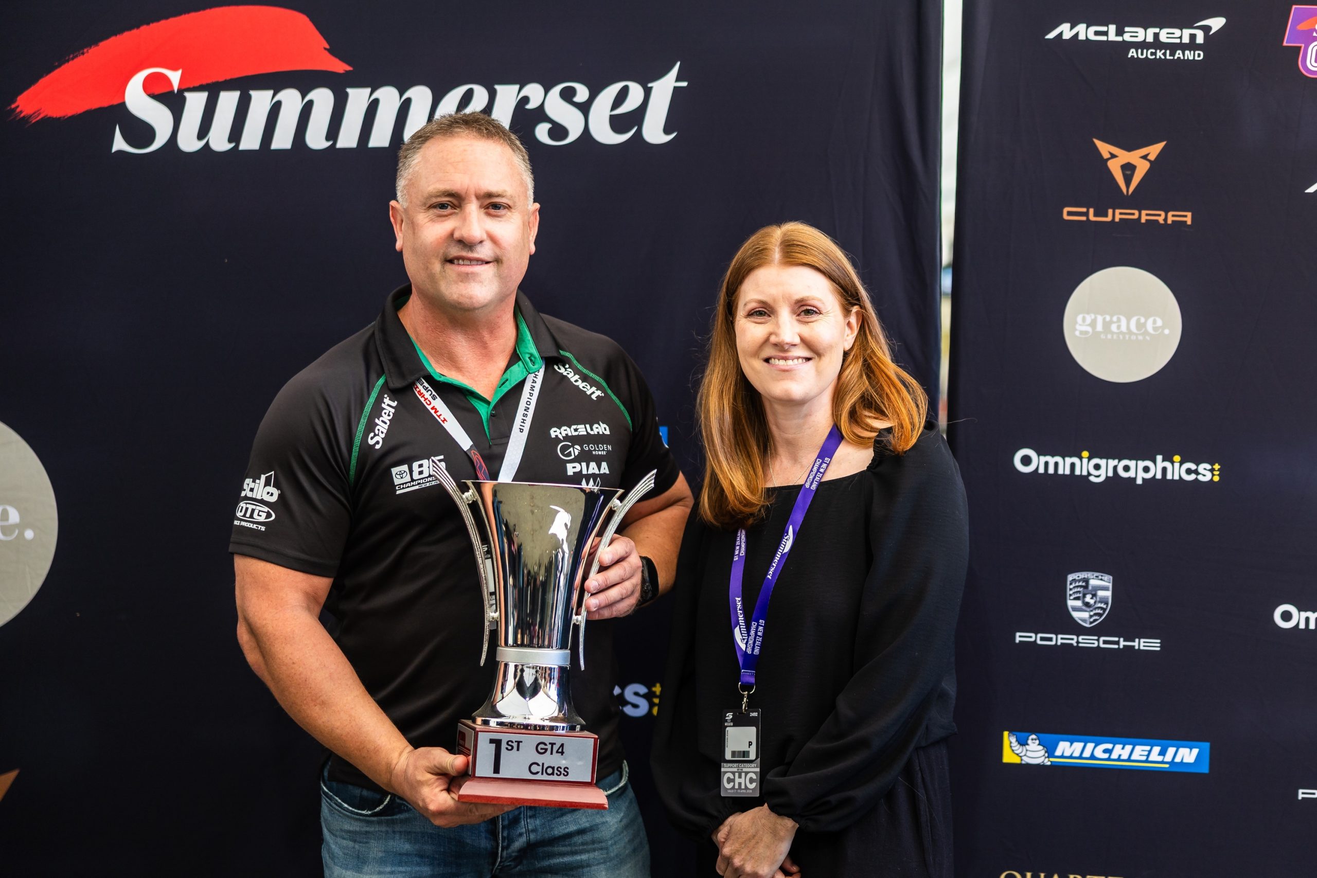 Glen Chappel won the GT4 Championship. Pictured with Ginny Guley from Summerset Retirement Villages. Image: Tayler Burke/Shots By TayB