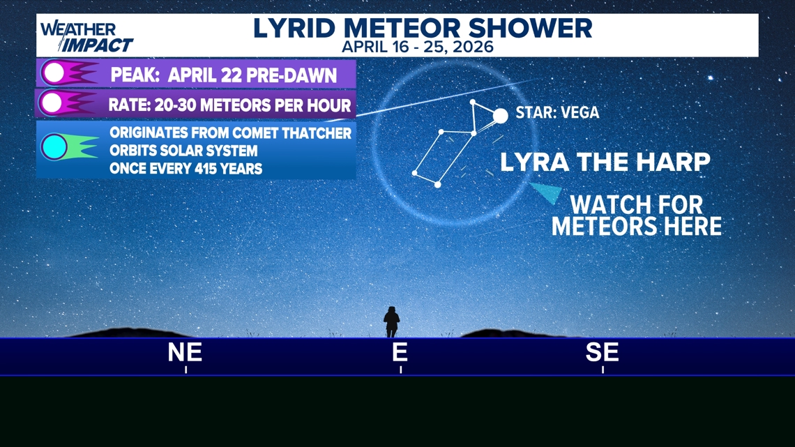 WASHINGTON — The Lyrid meteor shower, known for its speedy and bright fireballs, will peak Wednesday morning, giving stargazers the first chance to see shooting stars this spring.Â