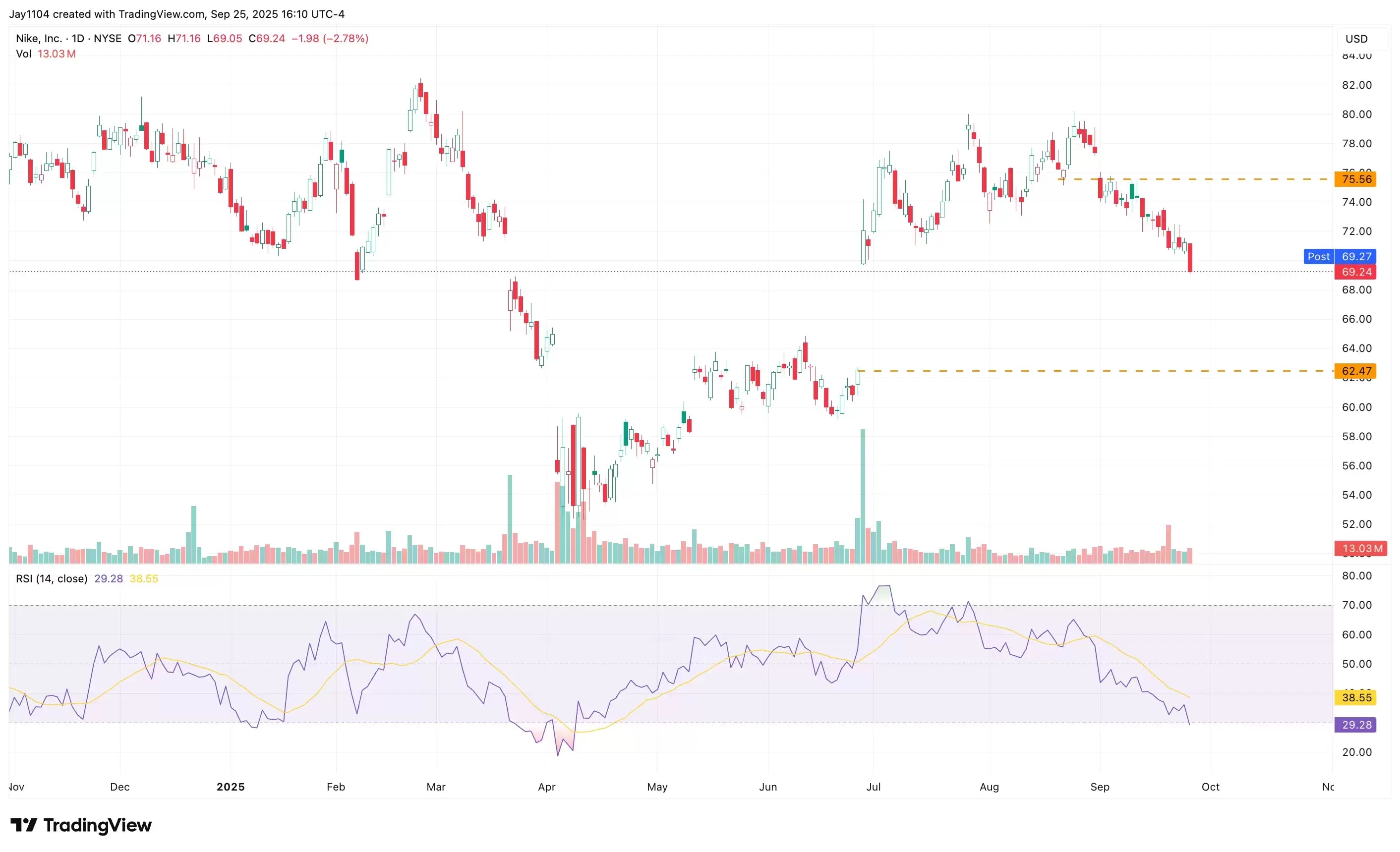 The technical chart below suggests that the stock is already oversold. The relative strength index (RSI) – the purple line on the lower panel – has slipped below 30, indicating oversold conditions, while the share price itself is sitting on the lower Bollinger Band. These signals suggest that Nike might be poised for at least a short-term rebound. If the stock rallies after Tuesday’s results announcement, it could rise towards $75, where a gap remains from late August. However, downside risks are significant. The large gap down to $62 means that a break below support at $67 could trigger a steeper decline.