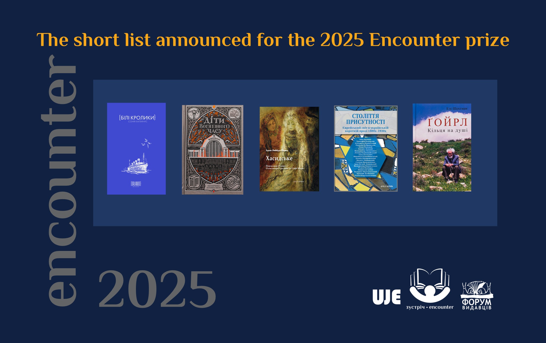 Join us in the announcement of the winners of the 2025 Encounter: The Ukrainian-Jewish Literary Prize, which celebrates outstanding contributions to Ukrainian fiction dedicated to the past and future of Ukrainian-Jewish relations. During the event, a presentation of the five shortlisted books will take place, featuring authors, translators from Yiddish and Hebrew, and editors who will share their thoughts on interethnic interaction and the modernity of intercultural relations. This year, the jury will have to choose between a mystical thriller, a classic novel, a fictionalized memoir, stories about Hasidim, and an anthology of works by twentieth-century Ukrainian writers about our Jewish compatriots. Members of the jury will also attend: co-founder of the Ukrainian book club in New York, Razom Book Club, and the volunteer movement in support of civil society, Razom for Ukraine, Maria Genkin (New York), Ukrainian writer and theorist of modern trends in literature and philosophy, Volodymyr Yeshkilev (Ivano-Frankivsk), and an outstanding translator from Slavic languages, member of PEN Ukraine, Ostap Slyvynsky (Lviv).