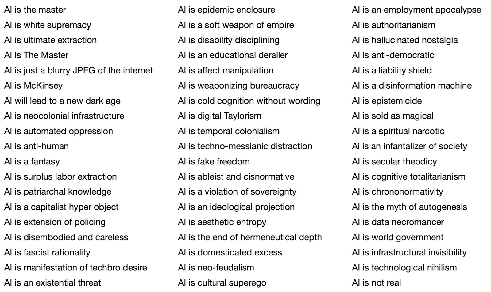 “AI is …” A representative but non-exhaustive selection of provocative characterizations of AI from contemporary Humanities books, articles and lectures. A representative index of the authors from whose work these ideas are sampled includes: Matteo Pasquenelli, Kate Crawford, Emily Bender, Alex Hanna, Dan McQuillan, Jordan Katz, Ruha Benjamin, James Poulos, Ted Chiang, Vladan Joler, Ruben Amaro, Shannon Vallor, Safiya Noble, Meredith Whitaker, Evgeny Morozov, Timnit Gebru, Byung-Chul Han, Yvonne Hofstetter, Manfred Spitzer, Gert Scobel, Nicolas Carr, Geert Lovink, Éric Sadin, James Bridle, Helen Margetts, Carole Cadwalladr, Adam Harvey, Joy Buolamwini, Wendy Hui Kyong Chun, Yuk Hui, and of course Adam Curtis.