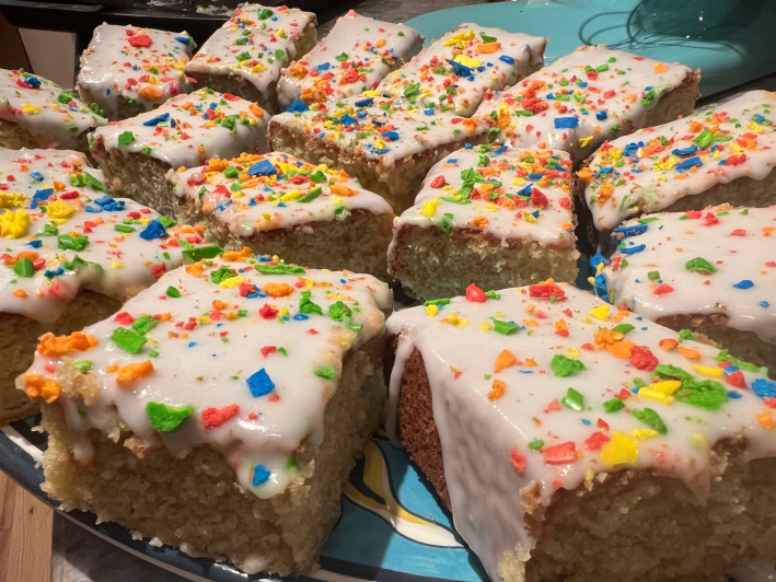KM: It is … not good. What we were tasked with making is essentially a yellow cake with a lot of eggs, plain icing with no flavoring, plain HOMEMADE SPRINKLES with no flavoring, and custard with a tiny bit of vanilla extract. This is a dessert for literal babies, which I guess makes sense in the “school cake” sense of it.