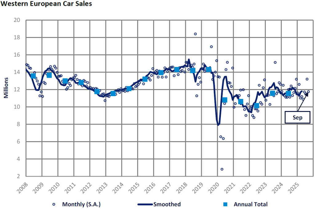 France and Italy also grew by 1% and 4% respectively; however, both results were disappointing as September 2024 is a weak base for comparison for both markets. France is grappling with persistent political uncertainty regarding its 2026 budget, which is undermining consumer confidence. Compounding the situation, newly appointed Prime Minister Sebastien Lecornu resigned after less than a month in office. Meanwhile, in Italy, sales have remained sluggish due to a weak economic backdrop — moving forward, the market should be supported by the implementation of a €600 million subsidy package under the National Recovery and Resilience Plan.