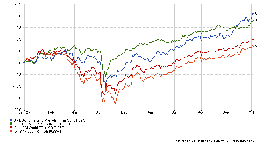 Emerging markets have taken centre stage so far this year, turning around performance and beating all major indices, as the chart below shows.