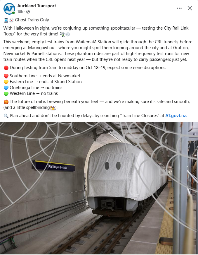 Note that trains will be impacted this weekend due to CRL testing. A week early for Halloween, but nonetheless pretty cute messaging from Auckland Transport: