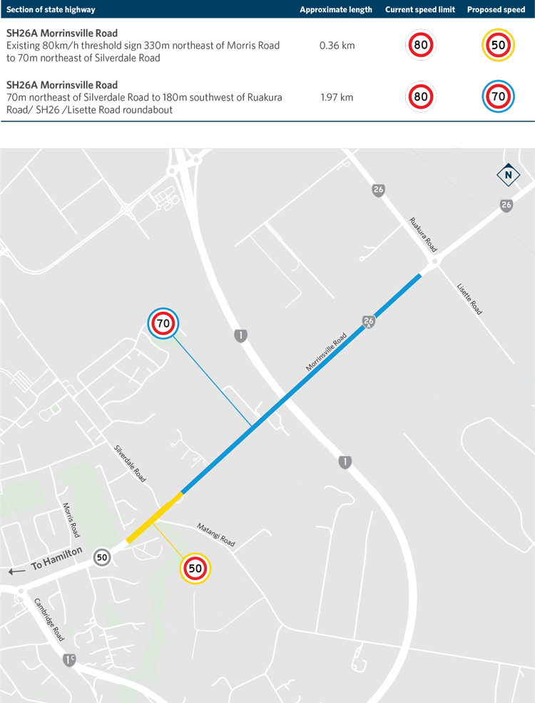 From 80km/h to 50km/h from the existing 80km/h threshold sign which is 330m northeast of Morris Road to approximately 170m northeast of Silverdale Road.From 80km/h to 70km/h from approximately 170m northeast of Silverdale Road to approximately 100m southwest of Ruakura Road / SH26 / Lissette Road roundabout.