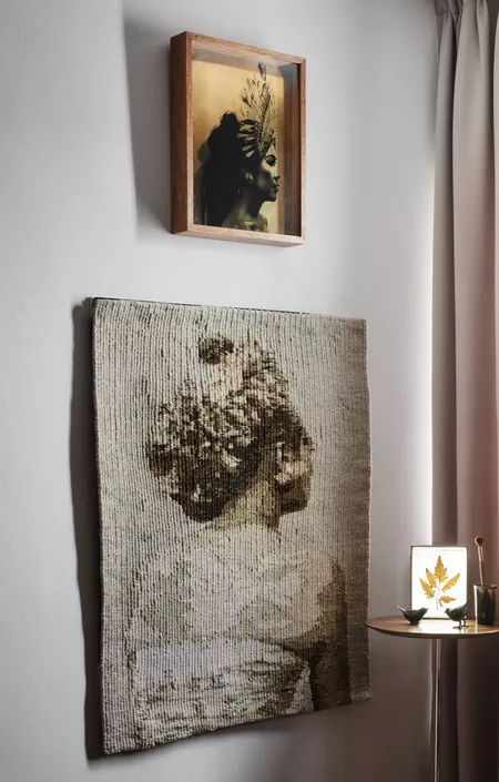 Here, Chan restages herself as the subject of an ethnographic portrait of Balinese women shown from a three-quarter back view. Golden threads glint in her earrings and hair ornaments, set against the muted tones of merino wool, imbuing the work with elegance and softness.