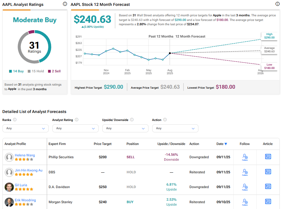 Turning to Wall Street, Apple stock has a Moderate Buy consensus rating based on 14 Buys, 15 Holds, and two Sells assigned in the last three months. At $240.63, the average AAPL stock price target implies a 2.8% upside potential.
