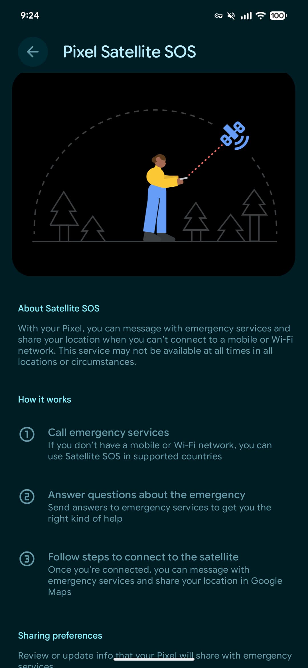 On our Pixel 7 Pro, going to Settings > Safety & emergency reveals “Pixel Satellite SOS” alongside Emergency SOS and Car Crash Detection. Tapping reveals the same introductory page as on the Pixel 9 and newer that explains “How it works,” and lets you set “Sharing preferences” across Emergency contacts and Your Google Account. It also notes how “Satellite SOS is included at no charge for 2 years.”