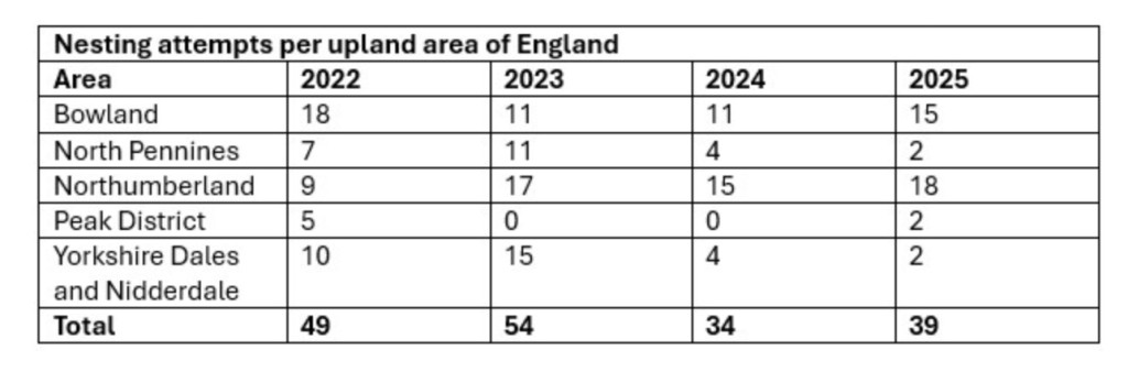 According to Natural England’s data, there were 39 nesting attempts in 2025, of which 33 were successful, up from 34 attempts (25 successful) in 2024. Natural England has presented the breeding attempts data in the following table: