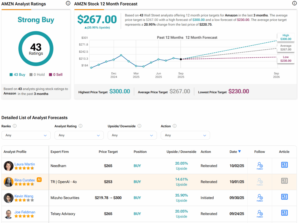 Turning to Wall Street, analysts have a Strong Buy consensus rating on Amazon stock based on 43 Buys assigned in the past three months. Furthermore, the average AMZN stock price target of $267 per share implies 21% upside potential from current levels.