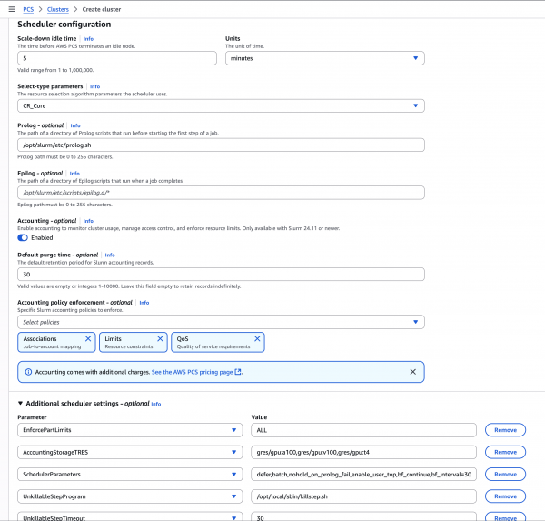 To explore the new functionality, log in to the AWS PCS console and open the Additional scheduler settings section when creating or editing clusters, queues, or node groups. For a programmatic approach, add SlurmCustomSettings to your CLI or SDK calls.Documentation for each parameter is available in the official Slurm manual.