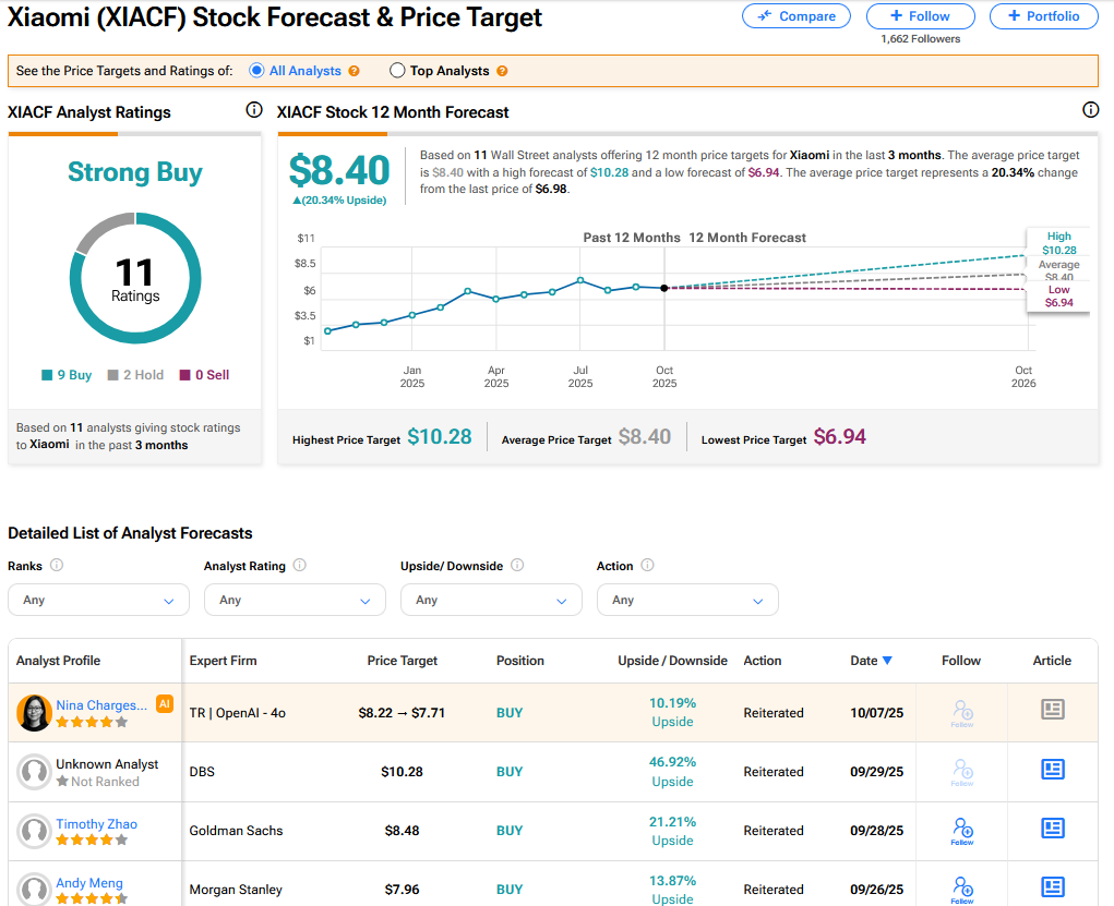 On TipRanks, XIACF has a Strong Buy consensus based on 9 Buy and 2 Hold ratings. Its highest price target is $10.28. XIACF stock’s consensus price target is $8.40, implying a 20.34% upside.
