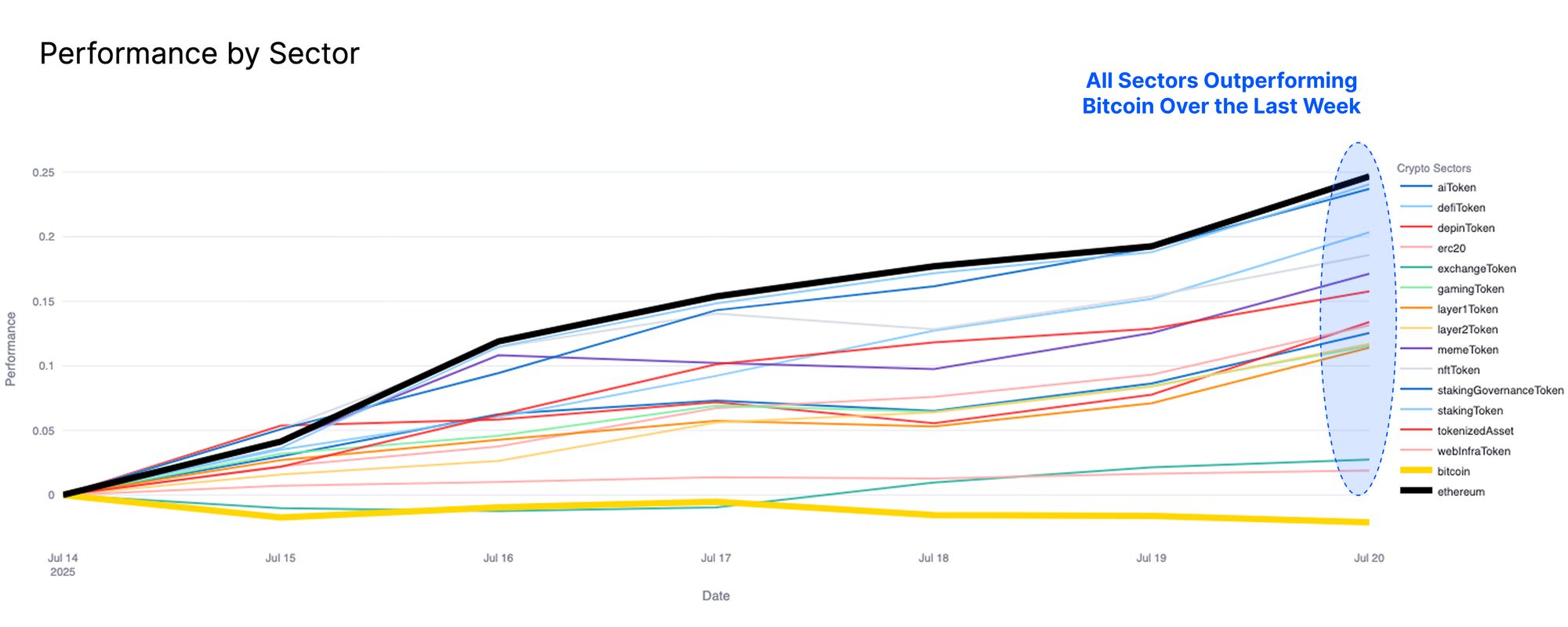 We can validate this observation by analyzing sector-level performance across the digital asset ecosystem over the past week. Bitcoin’s recent consolidation is evident, with price action remaining largely flat over the last week. By contrast, all other digital asset sectors are now outperforming, led most notably by Ethereum. This mechanic is a classic example of capital rotation along the risk-curve.