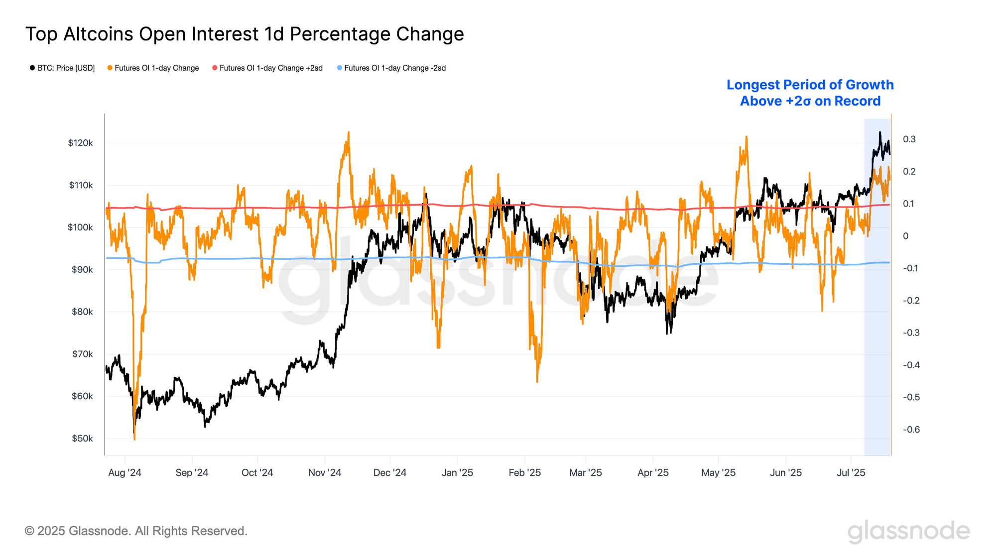 When evaluating this magnitude of aggregate open interest growth, we find that recent daily increases have remained above the +2 standard deviation threshold for more than 12 consecutive days, the longest stretch on record.