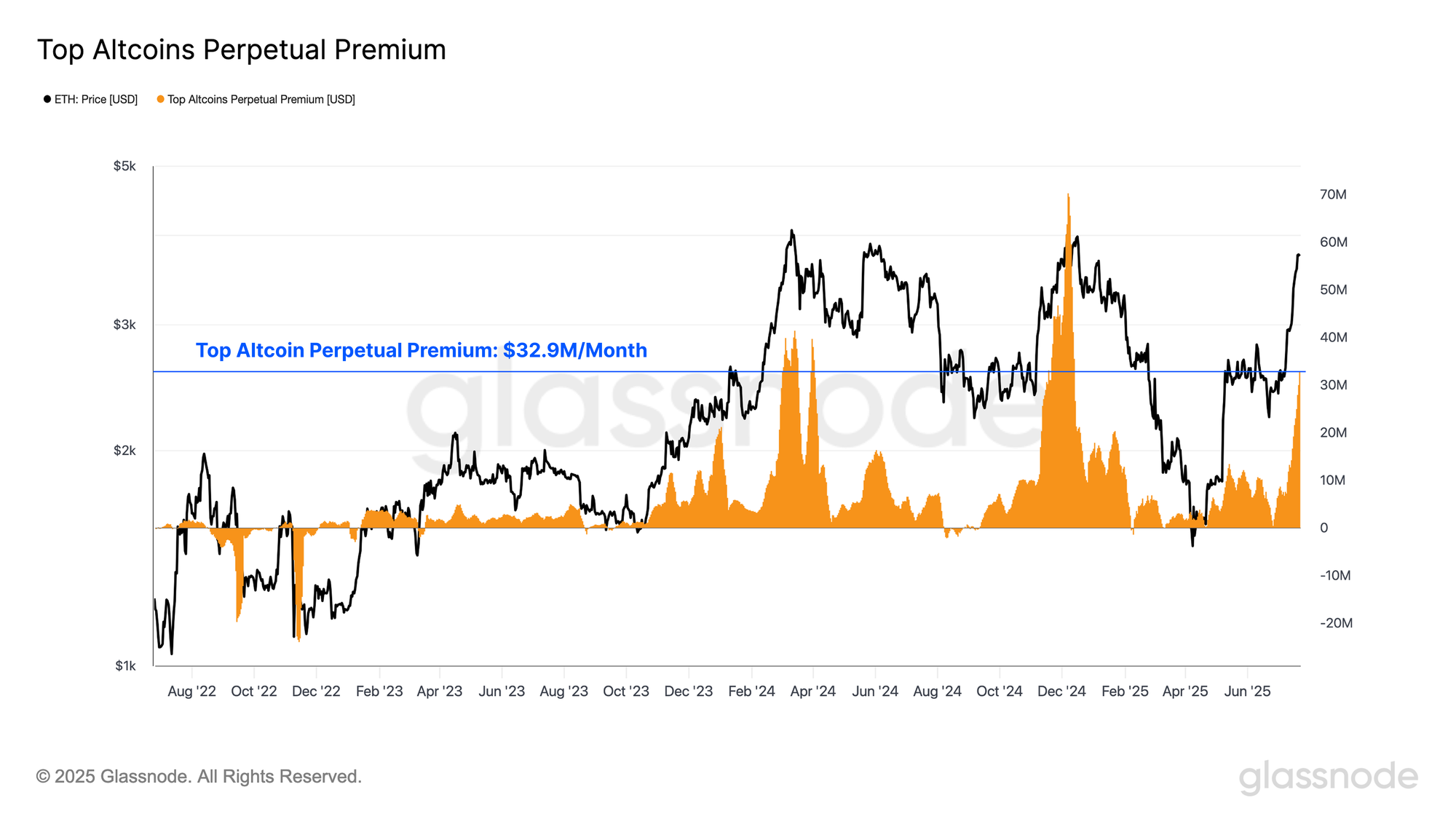 The cumulative monthly funding premium paid by long-side futures contracts over the past 30 days can be a useful gauge for speculative appetite. Here, we look at monthly premium paid across the top altcoin assets, and we find that the total cost of leverage has reached approximately $32.9M/month.