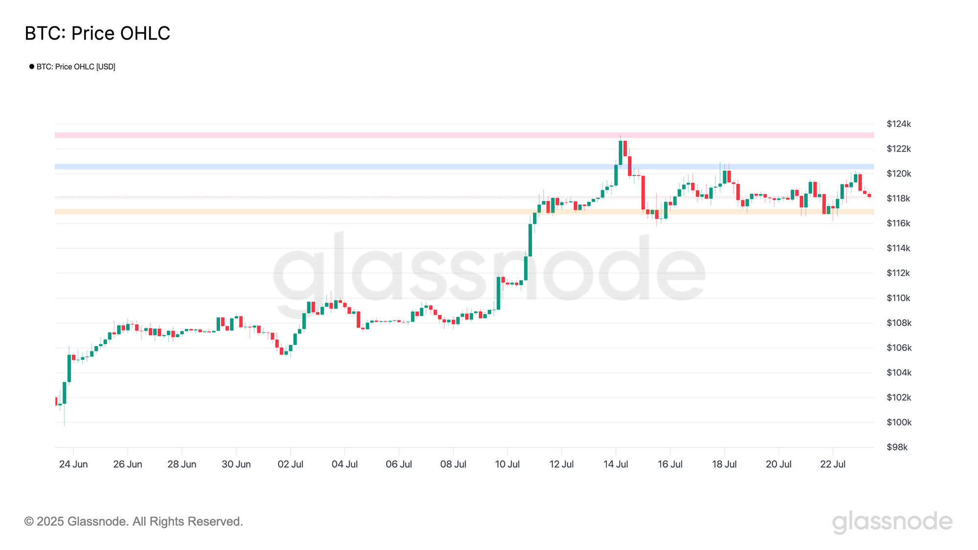 July has been an explosive month for Bitcoin, marked by a surge in upside volatility, with the price rallying from a weekly low of $105.4K to set a new all-time high of $122.7K. Near-term momentum has cooled off later in the week, and the Bitcoin price has been consolidating and coiling just below its ATH since then.