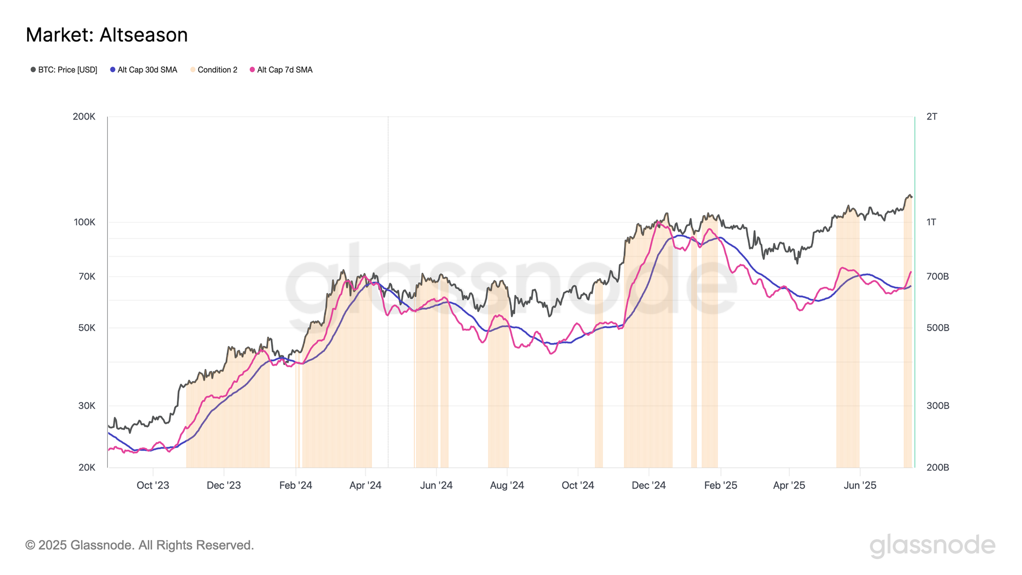 From the perspective of this model, Altseason conditions first emerged on July 9th and has remained in effect since, suggesting the ongoing redistribution of capital across the broader crypto landscape.