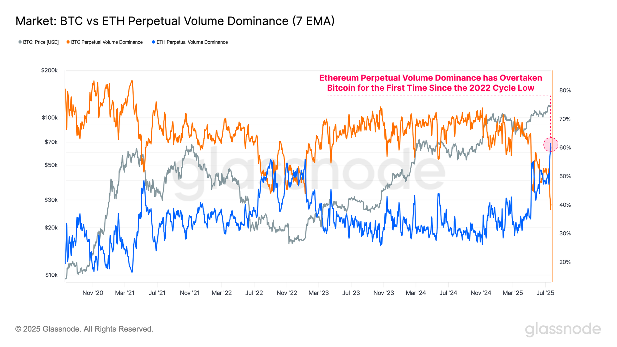 With the altcoin sector having largely underperformed throughout this cycle, the recent spike in performance marks a notable shift in investor behavior. This is particularly evident in the perpetual futures landscape, where Ethereum’s perpetual contract dominance has reached an all-time high, surpassing Bitcoin for the first time since the 2022 cycle low.