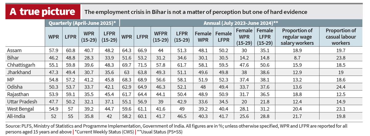 The situation needs to be looked at objectively, for which official statistics are useful. Under the Periodic Labour Force Survey (PLFS), the latest State-level indicators on employment are the April-June 2025 quarterly report and the July 2023-June 2024 annual report, with insights on Bihar.