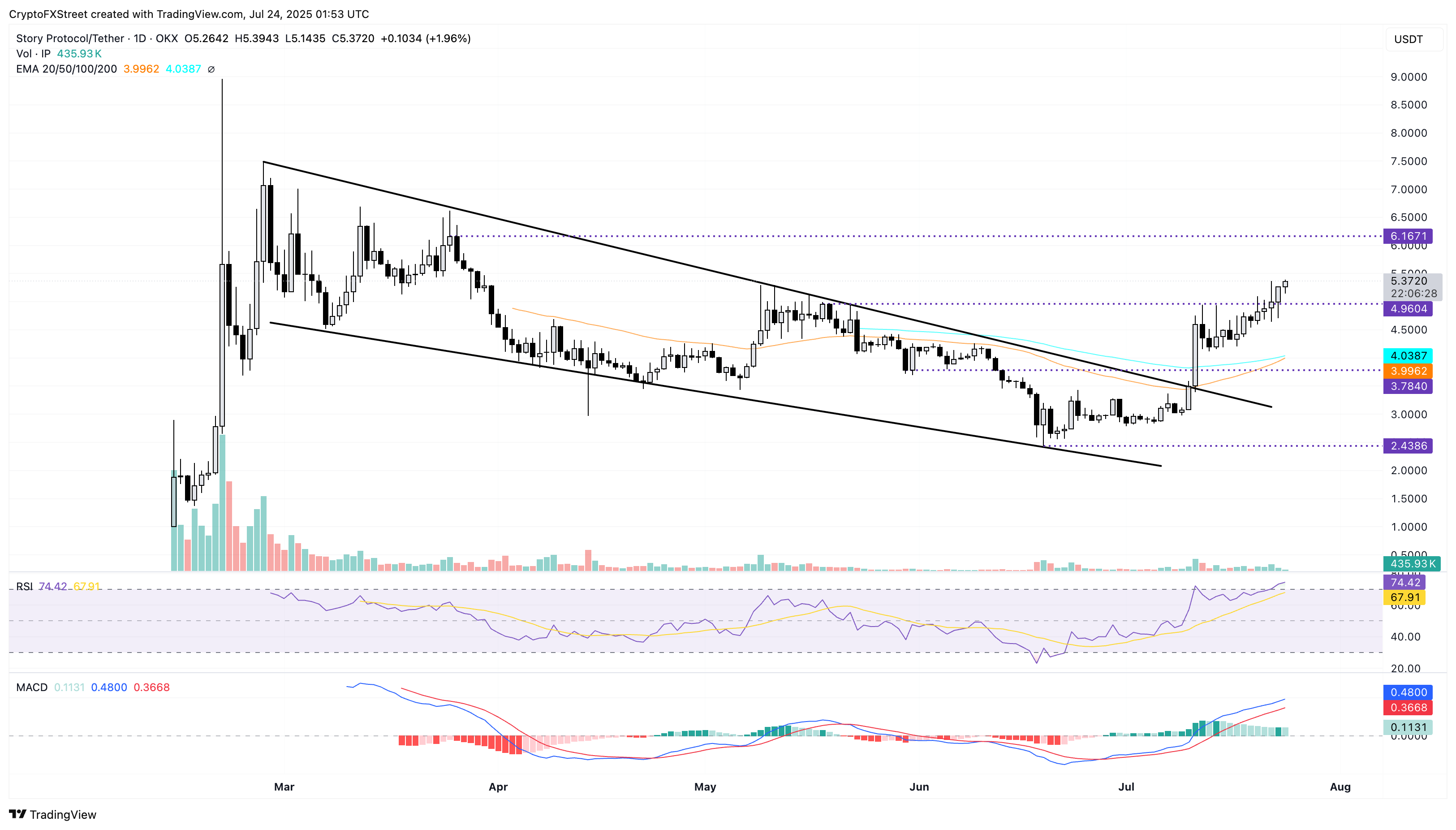 Story edges higher by nearly 2% at press time on Thursday, printing its fifth consecutive bullish candle. The wedge breakout rally on the daily chart gains traction as it crosses above the $5.00 psychological mark.