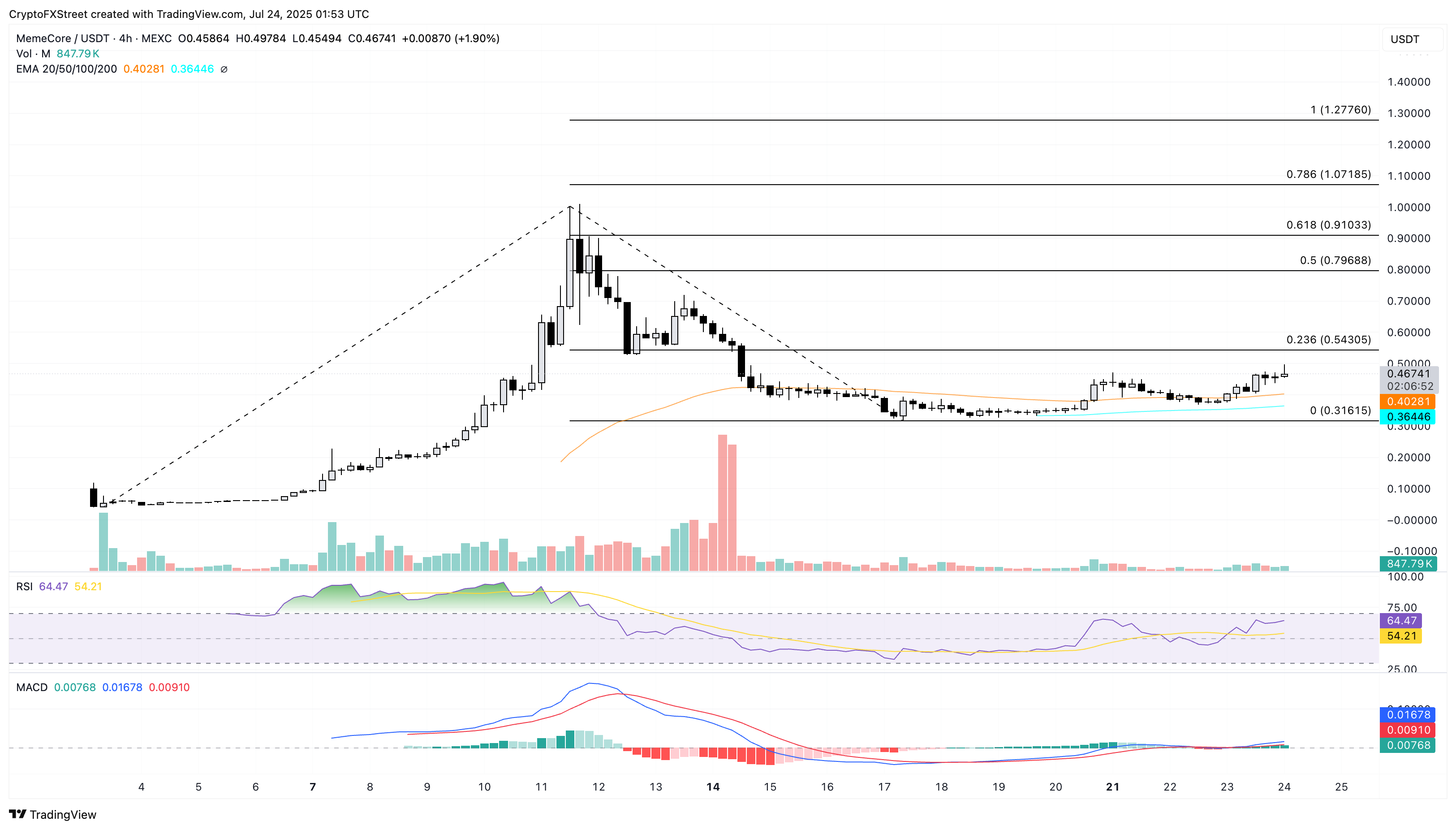 Memecore edges higher at press time on Thursday within a sideways track on the 4-hour price chart. The recent recovery targets the 23.60% trend-based Fibonacci level at $0.5430 as Memecore inches closer to the $0.5000 psychological level.