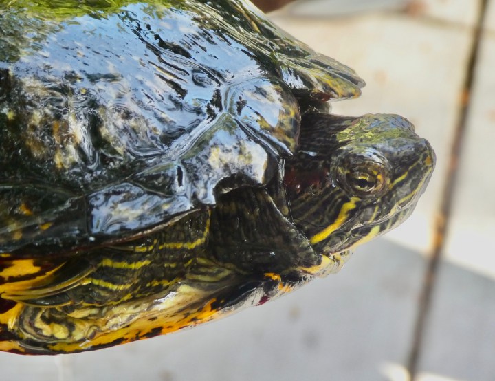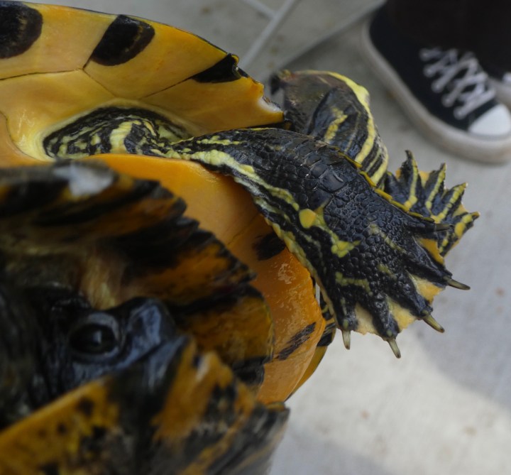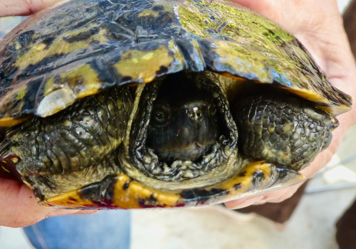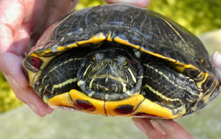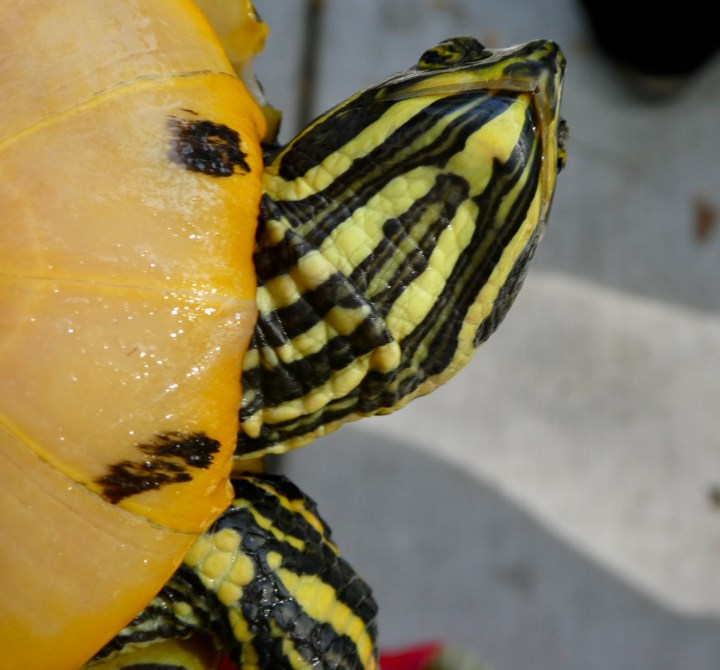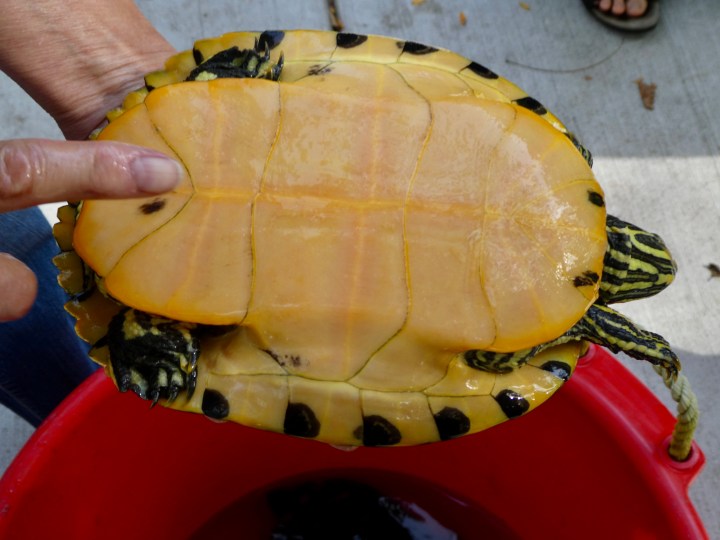 Bottom view. As you see, these turtles can be distinguished by the pattern on the bottom of their shells (compare to the ones above and below).