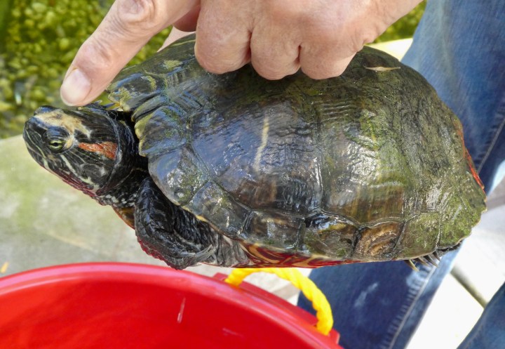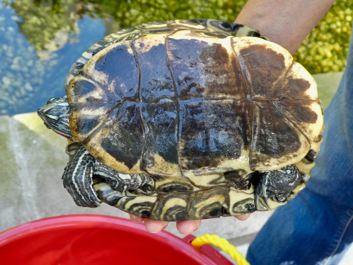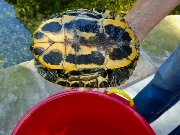 But on October 2, the first three were released. All of the turtles were red-eared sliders (Trachemys scripta elegans), a species that is now native here, as the range has moved northward as the climate warmed. Again, these turtles must have lived in Botany Pond for a number of years when they were removed. Since it’s changed a lot since they lived here, I wonder if they remember it?