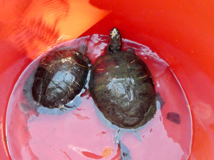 One just about to be introduced to the pond, hopefully her forever home. You can see a bit of the red stripe behind her eye.