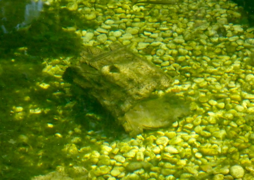 They will spend the winter in hibernation; right now Facilities is feeding them frozen smelt, and they can also eat the minnows supplied in the second release (below).  The turtles will spend the winter huddled in special “turtle caves” that Facilities has put on the rocky pond bottom (below); they can breathe from their butts (“cloacal respiration”) while hibernating.  Here’s one of the turtle caves: