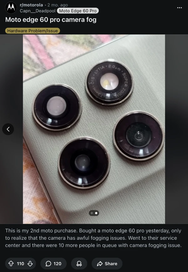 That said, we’ve seen similar complaints from users with Samsung devices like the Galaxy Note 20, S23 Ultra, and S20 in the past. There were reports about the same on Vivo phones like the X200 series and iQOO Neo 10R. Then, there was a lot of chatter about the camera fog on the Xiaomi 14. So yeah, it’s an industry thing, but the Edge 60 Pro has too many reports to ignore.