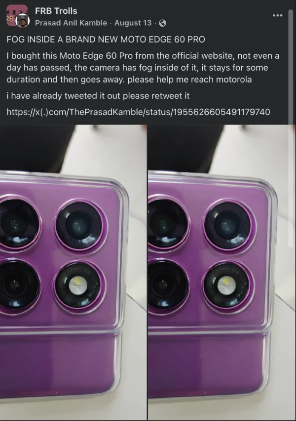 Even on Facebook, in groups like FRB Trolls, Prasad Anil Kamble posted in August about fog on his unit, which he purchased from the official site less than a day old, asking for help reaching Motorola.